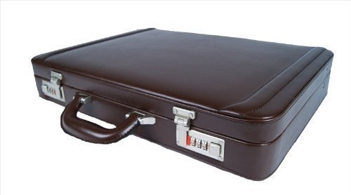 Brown Slimline Leather Briefcase in Faux Brown soft Leather Gorgeous Leather look Slimline Briefcase from Roamlite Synthetic Brown Leather (Outer Briefcase Material) Metal Matte Chrome Fittings Two Combination Locks Padded Comfort Grip Handle Metal Feet (Standing Briefcase Upright) Expandable Documents Section (Inside Briefcase) Auto-Lock Safety Hinges (Holds Briefcase Open) Velcro PDA/Phone Pocket (Inside Briefcase) Zip Pocket (Inside Briefcase) Envelope Pocket (Inside Briefcase)